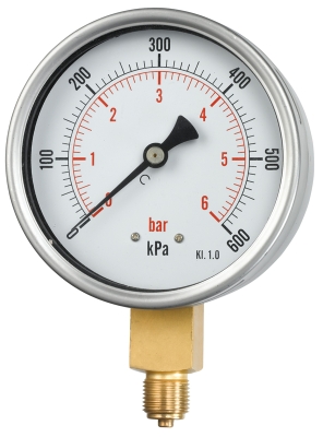 hus i borstat stål mätsystem och anslutning i mässing. Noggrannhetsklass 1,0% dubbelskala bar/pascal.