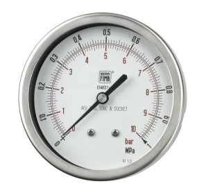 Tryckmätare typ MGS18 100mm med hus i rostfritt stål och mediaberöda delar i syrafast stål , dämpvätskefylld för applikationer där tryckstötar och vibrationer förekommer för aggressiva vätskor och gaser.