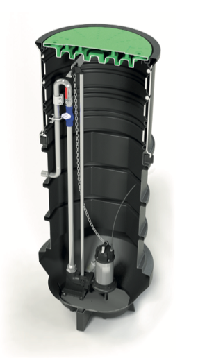 Flexibel pumpstation med två inloppshöjder. Stationen är utrustad med en justerbar hals som möjliggör att totalhöjden kan varieras mellan 2170 - 2700 mm. Materialet är polyeten med inblanding av återvunnit materal för minimal miljöpåverkan.
