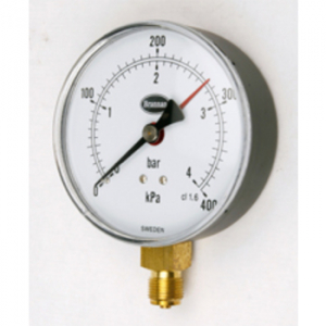 Hus i stålplåt och akrylglas Medieberörda delar i mässing Noggrannhetsklass 1,6 Maxtemperatur: 60 °C Vid höga temperaturer rekommenderas vattensäcksrör för att skydda tryckmätaren Dubbelskala: pascal/bar