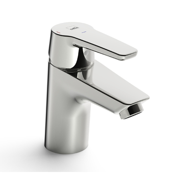 Tvättställsblandare med Eco-top kallstartskassett. Fast utloppspip och strålsamlare. Ecoflöde max 6l/min. Energiklass B. Inbyggd spärr för begränsning av temperatur och flöde. F= flexibel anslutning.